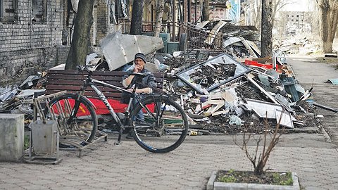Пока говорю со Светой, замечаю, что за ее спиной, с другой стороны улицы все время ходит немолодая женщина - выносит строительный мусор, обломки оконных рам. Перебегаю через улицу, нахожу набитую ногами тропку. Просто так здесь по траве ходить не нужно. ВСУ закидывали город «лепестками» прямо во время боев, пытаясь помешать штурмующим. Где живет женщина, определить несложно. Мертвая пятиэтажка, двери подъездов, затянутые паутиной, заваленные обломками, и вдруг… цветничок! Дверь даже покрашена в веселый голубой цвет, на ней написано мелом: «Здесь живут люди, четыре человека». Стучусь, кричу: «Есть кто живой?». Есть. Выходит женщина, называется Ритой и даже говорит мне немного кокетливо: