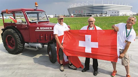 Пробили выезд на тракторе и трое швейцарцев – 55-летние Бит Штудер и Зепп Виер, а также 68-летний Вернер Циммерман. Прошлой осенью друзья коротали вечер за кружкой пива. Один сказал: «А давайте поедем на чемпионат в Россию!» Другой пошутил: «Ладно, но только на тракторе». Сказано – сделано. Выбрали ретротрактор (стильный Buhler 1964 года выпуска), машину сопровождения (дом на колесах) и матч с Сербией в Калининграде. От точки старта – Люцерна – 1800 км. При скорости 30 км/ч на дорогу ушло две недели. Водители менялись в пути: один управлял трактором, второй – фургоном, а третий спал.